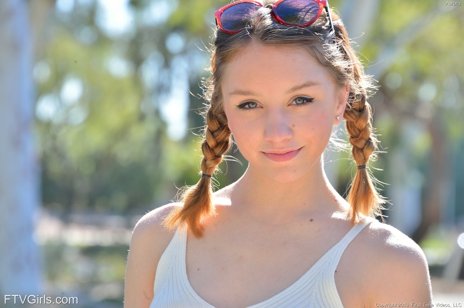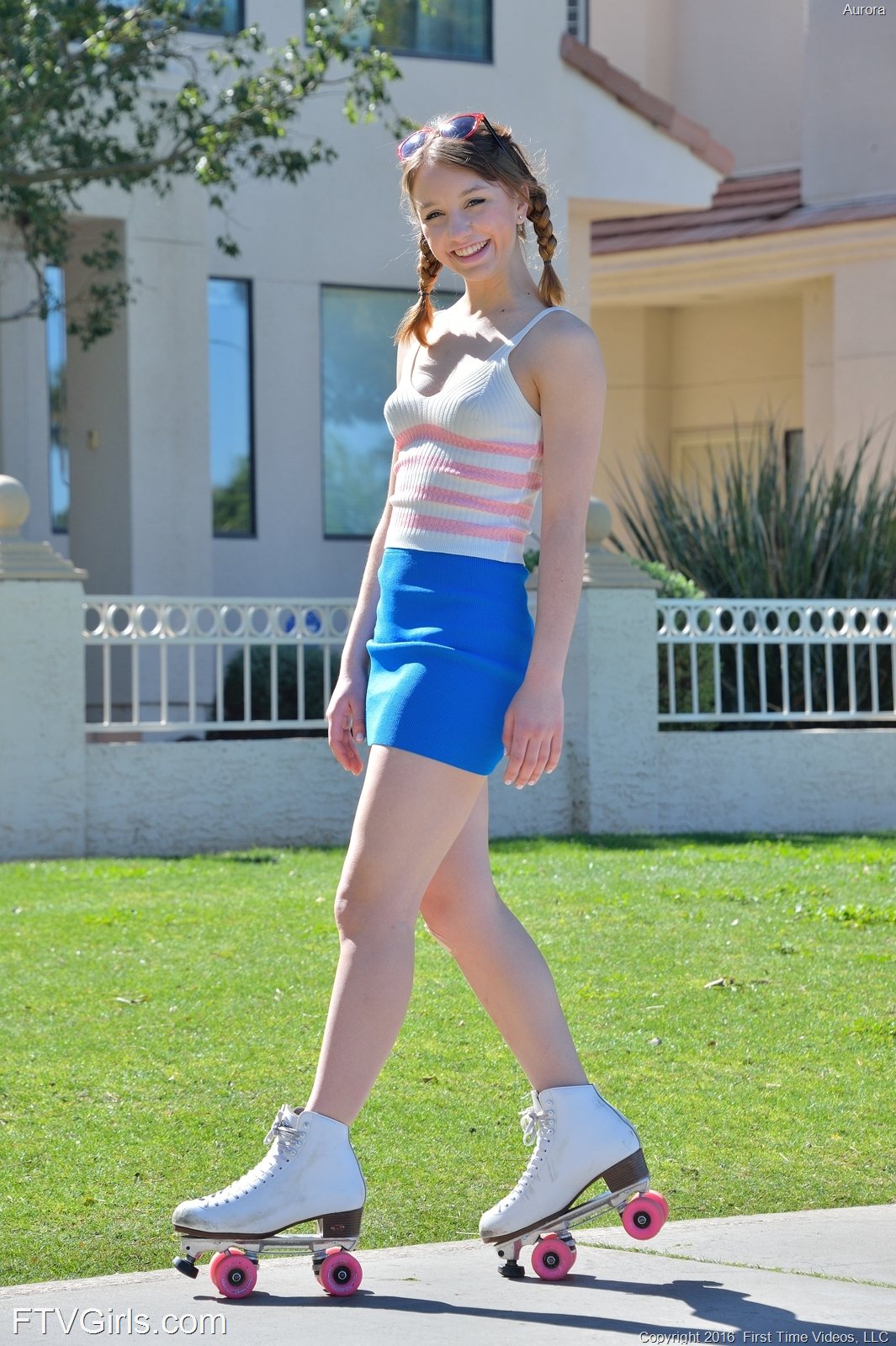 Aurora is an adorable girl shown outside in a short skirt and roller skates. She attracts attention from all over the place. Guys are staring a hole through her as she skates on by. She takes a little bit of a spill into the yard. She opens her legs up and reveals her panties. She slips off her panties that get dirty and her shaved pussy is exposed. As she sits down she starts to finger herself a little bit. She starts working another finger in and moans. She really knows how to get herself going.