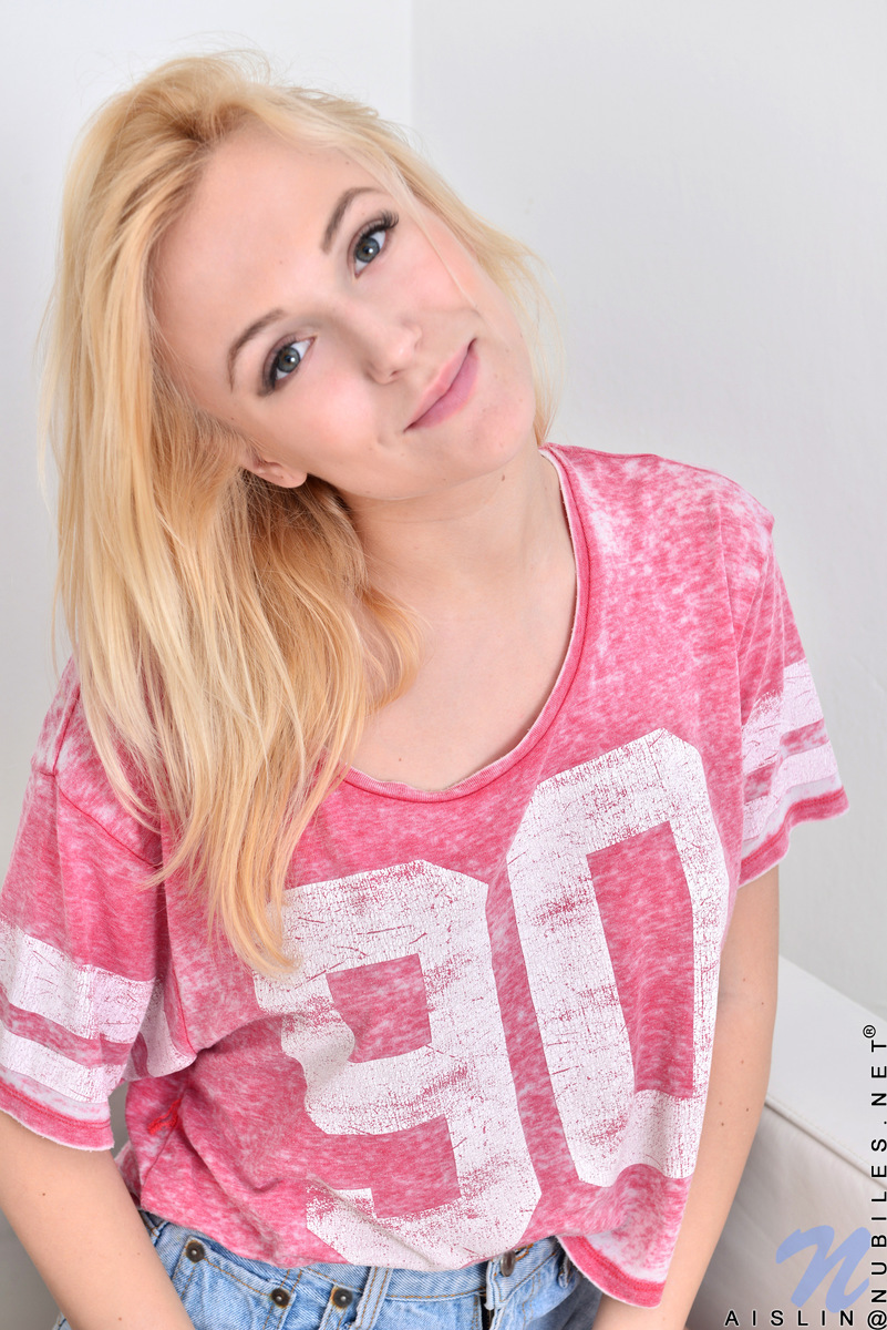 Nubiles blonde beauty Aislin is wearing a cute top and tiny jean shorts today. She loves to tease the camera and as she shits in a chair she slowly lifts up and down her shirt exposing her small perky tits. Her nipples are nice and hard and we can tell. She then takes off her shorts and lays back completely naked. She starts to rub her pink pussy with her fingers making it juicy and wet. She turns around and spreads her legs. She fingers her pink pussy and starts to moan out louder and louder!!!