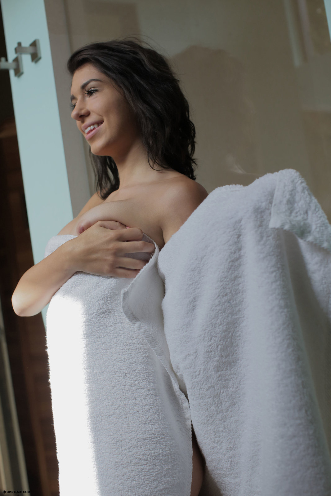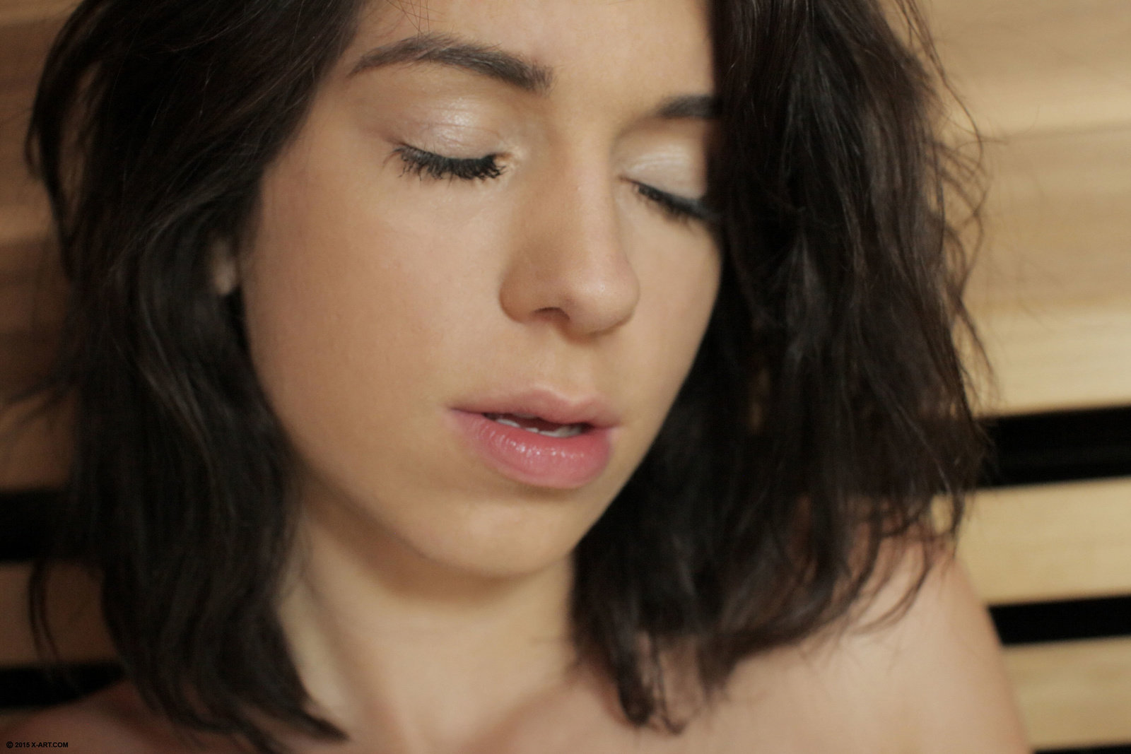 Joseline Kelly is an adorable young brunette with a nice pair of natural boobs. Today she is doing a shoot for X-Art in the sauna. She goes in just wearing a towel. It isn't long before she gets all hot and bothered. She is completely nude and she spreads her legs. She is dreaming about having sex in the sauna. She wishes someone else would enter but it's just her. She will just have to play with herself for now. She rubs her pink pussy from behind and is about to cum. Just then she hears someone opening the door.