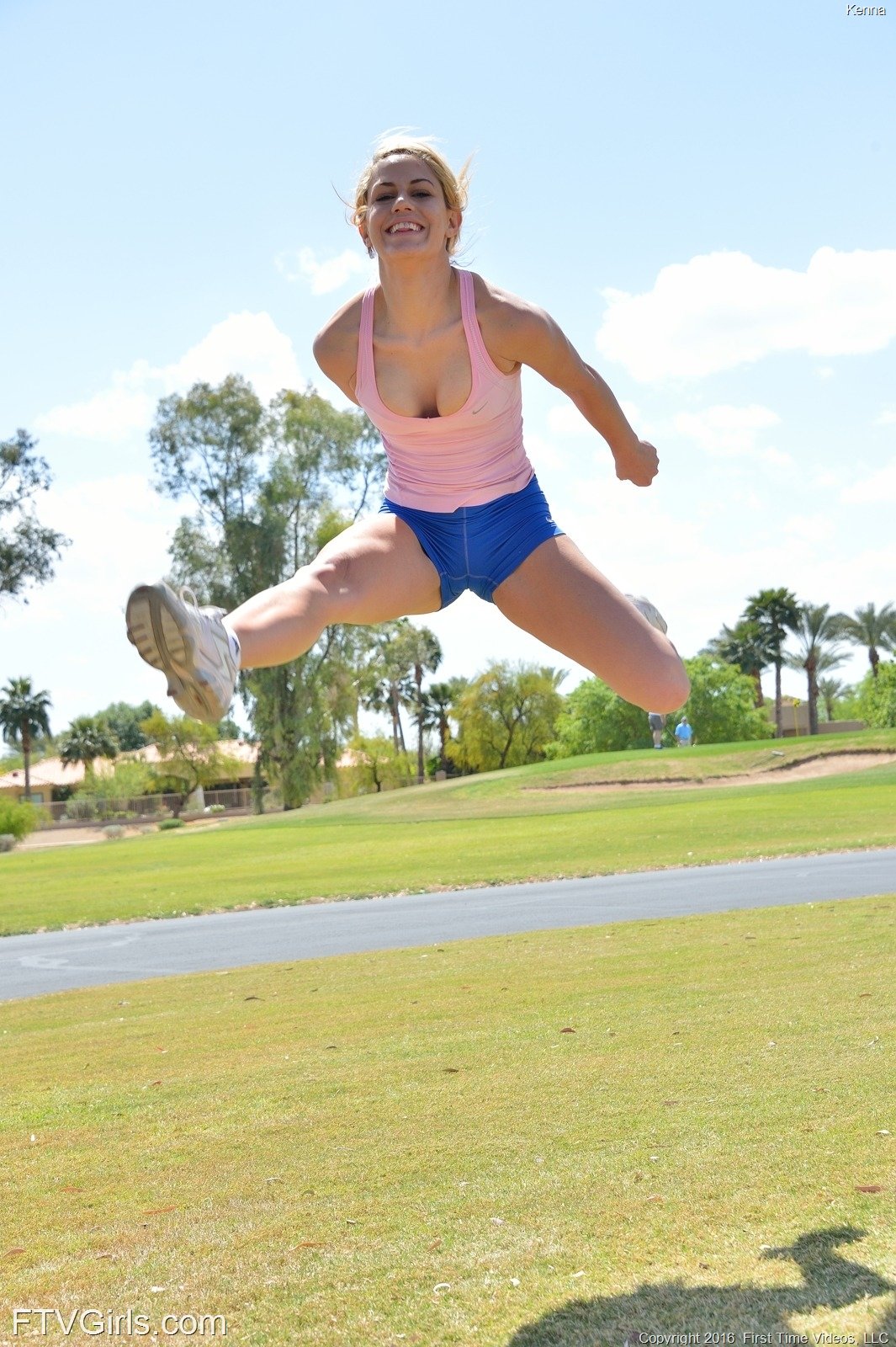 Young perky blonde Kenna is with us today working out outdoors. She really loves running outdoor and often gets horny as she does it. She has been known to sneak off during a workout just to masturbate. Hopefully we will get lucky and she will do just that. After getting warmed up with some nice stretching she feels the need to take off her clothes. She has a hot little body and we enjoy shooting it. She gets the the top of the hill and takes out her new sex toy. She starts working it deep into herself.