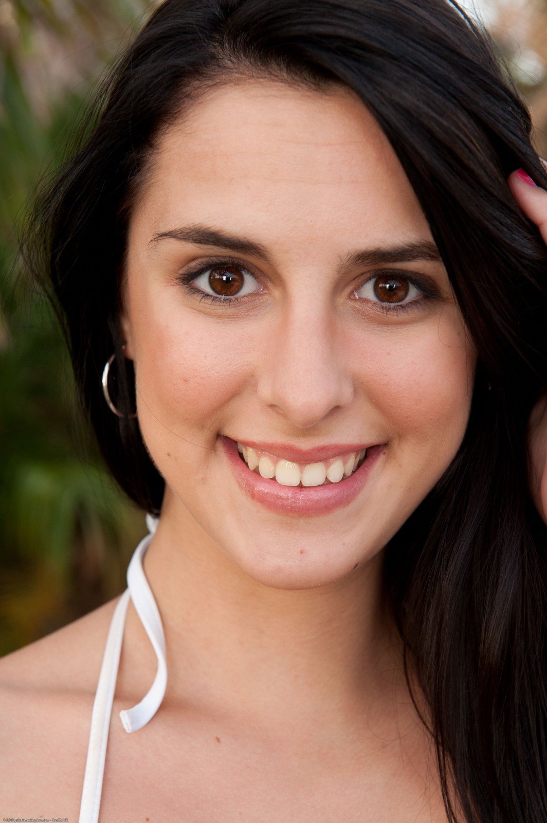 Today we have a dark haired beauty by the pool. Her name is Alannah and she loves to sit by the pool. Today she is wearing a sexy little bikini and all alone. She is getting the urge to reveal herself so she pulls her panties to the side and shows that little pink hole. She teases it a little with her fingers. Then she takes it off completely. Her pussy is ready and tight. She then shows off that round little rump. Wow this girl is just waiting to be fucked. She teases her self a little more and then kisses to the camera.