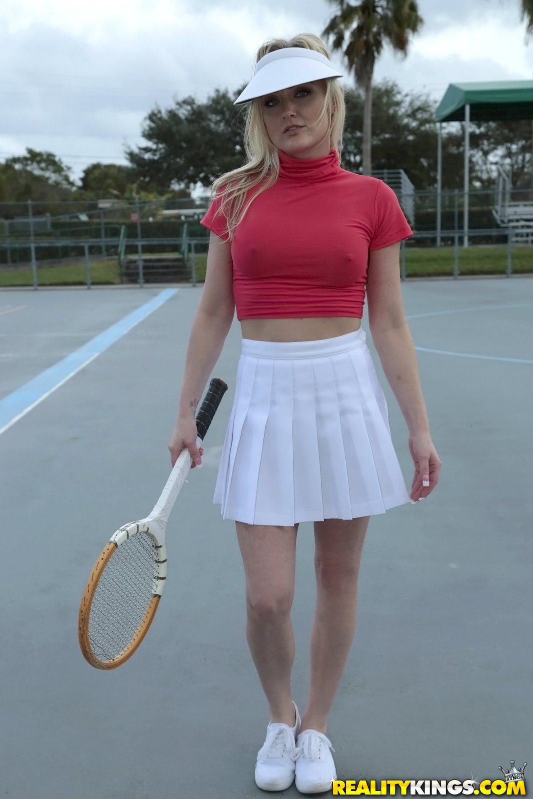 Tennis playing babe Kristina Reese is outside hitting a few balls today. Jake has been one of her tennis partners for awhile now. She has had a crush on him but he has a girlfriend. Well this isn't going to stop her today. She stops over at his place to pickup some more balls. Little does he know which balls she is going to be picking up. She gets on her knees and starts giving him a blowjob. He starts nailing that tight pink pussy from behind. She is loving his huge dick invade her so deep. He pulls out and covers her face in jizz.