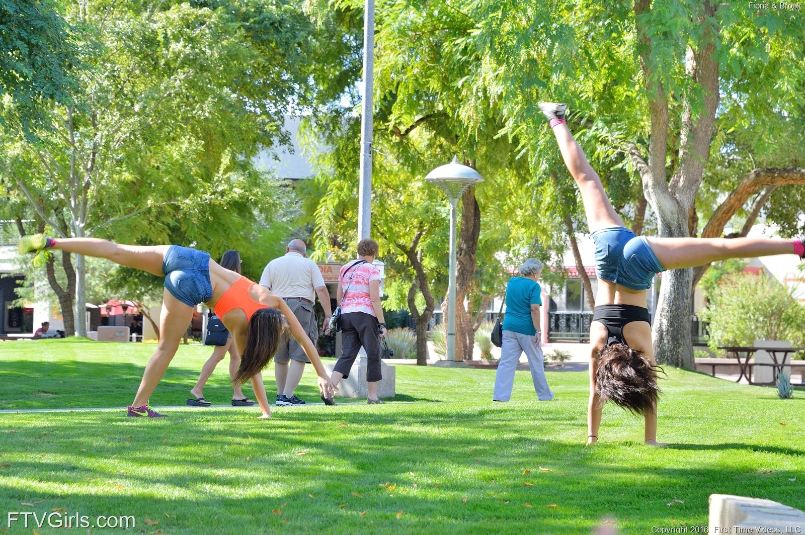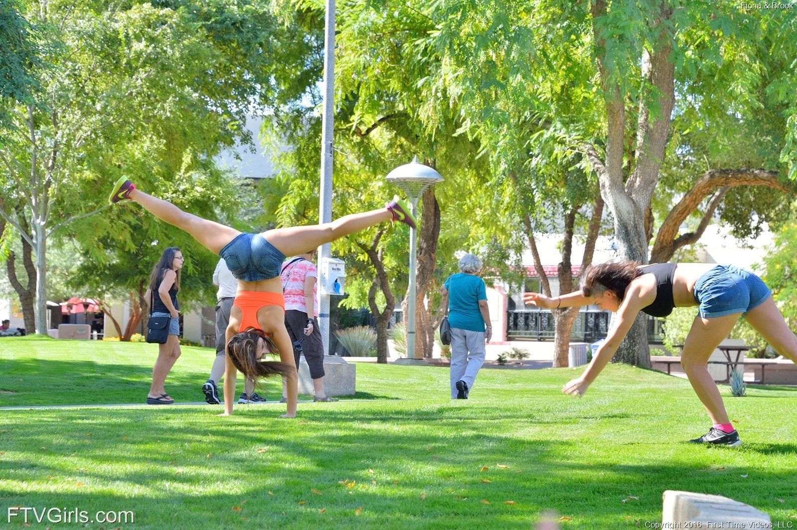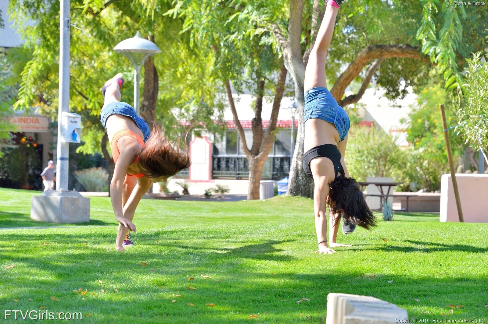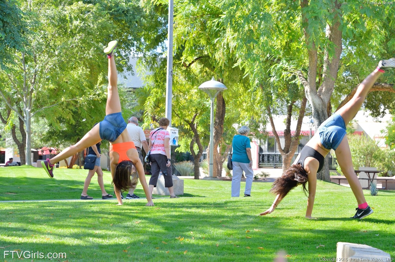 Today we have two teenie girlfriends Brook and Fiona. They are about to have some fun outdoors. They both have cute little tops and little jean shorts on. They are to do some cartwheels. All kinds of guys in the park are checking them out and they love it. They both bend over next to a tree and show off their asses. It doesn't stop there. They press bodies together and start making out. People are looking at them from all directions now. These girls are some real hotties and they know it. They walk home to have lesbian sex.