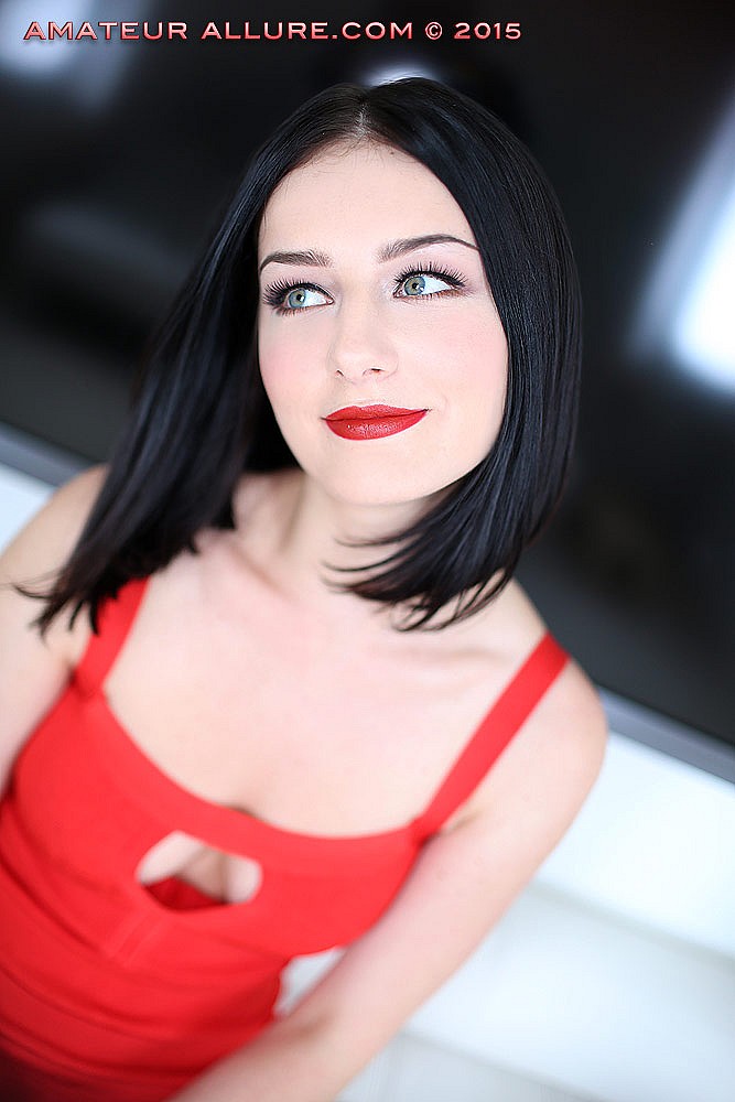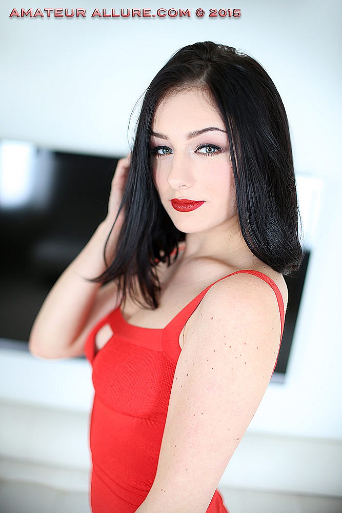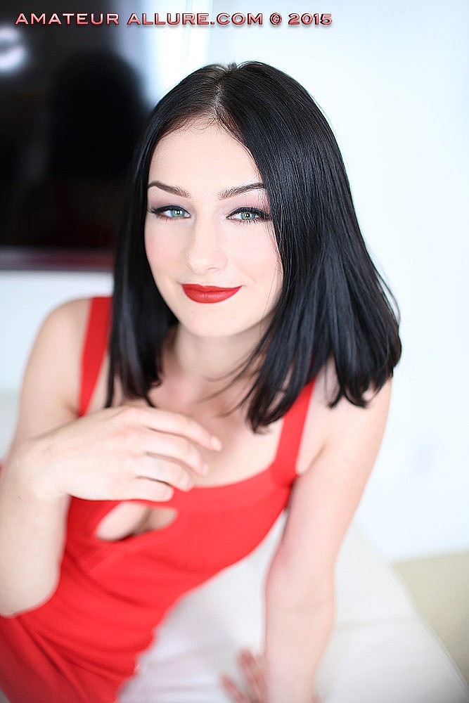 A sexy young girl named Amanda is featured in this clip from Amateur Allure. The Arizona girl is wearing a red hot dress and sexy black high heels, lounging sensually across the sofa as she flirts with the camera man. She lets him have a sneak peek between her legs as she teases him. The raven haired beauty soon reveals her naughty side, wrapping her red lips around his dick. She takes her time, sucking on the head and working her way down his hard shaft, looking up at him with her big blue eyes. Soon she's riding his dick with her tight shaved snatch, bouncing up and down and clearly enjoying every moment of pleasure. She bends over and lets him fuck her doggy style as hard and fast as he wants until he asks her to open her mouth to receive his cum offering.