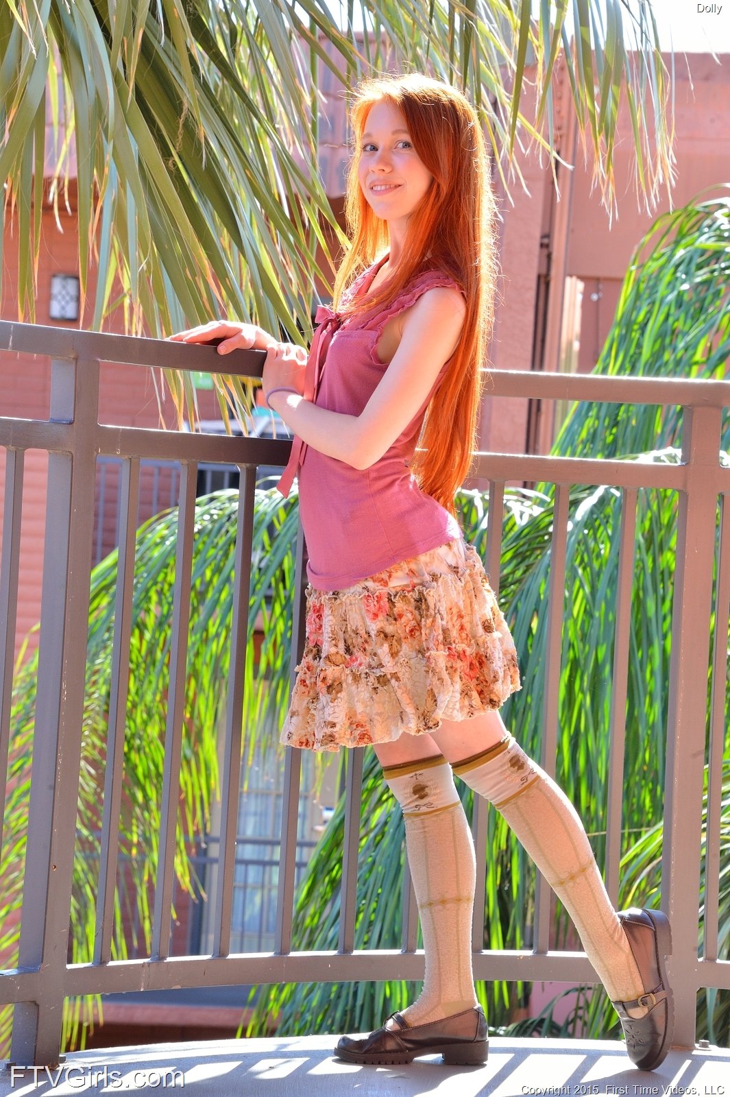 Tiny teenager Dolly from FTV Girls is so cute, with her long red hair and innocent face. Even though she's super skinny, she has ample tits and a nice tight tush. Here she is in a little skirt with tall socks and white panties. She lifts her skirt a little and pulls her panties aside to show you what she has to offer, a sweet little shaved pussy. When she raises her shirt up to flaunt her breasts, you'll be surprised at how big and full they are. She has fun posing outside without her panties on. Her skirt is raised so you can see her perfect ass and smooth snatch while she leans forward up against the balcony railing. She's the ultimate tease.