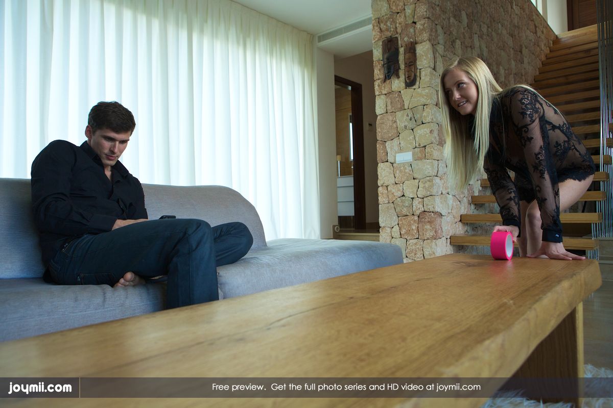 Provocative beauty Sicilia from Joymii really needs some attention from her boyfriend. She puts on a lacy black bodysuit and climbs onto the coffee table in front of him. This stunning blonde babe poses naughty for him on the table, getting him aroused so she can finish seducing him. She pulls down his pants and eagerly devours his boner. Then she begs to be tied up so he can have his way with her. He tapes her hands together and commands her to get on her knees so he can play with her horny snatch. She willingly complies with all his requests, sucking and riding his dick. She loves being submissive and gets off pleasing her man.
